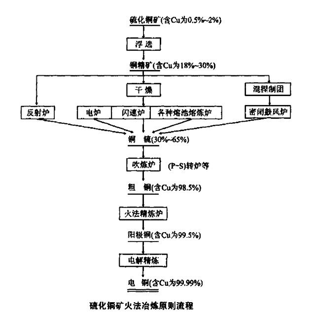 • 通过熔融冶炼和电解精火炼生产出阴极铜,也即电解铜,一般适于高品位的硫化铜矿。火法冶炼一般是先将含铜百分之几或千分之几的原矿石,通过选矿提高到20-30%,作为铜精矿,在密闭鼓风炉、反射炉、电炉或闪速炉进行造锍熔炼,产出的熔锍(冰铜)接着送入转炉进行吹炼成粗铜,再在另一种反射炉内经过氧化精炼脱杂,或铸成阳极板进行电解,获得品位高达99.9%的电解铜。该流程简短、适应性强,铜的回收率可达95%,但因矿石中的硫在造锍和吹炼两阶段作为二氧化硫废气排出,不易回收,易造成污染。近年来出现如白银法、诺兰达法等熔池熔炼以及日本的三菱法等、火法冶炼逐渐向连续化、自动化发展。