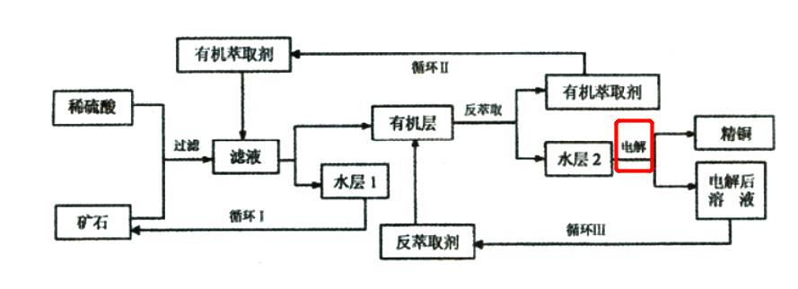 • 其工艺流程图如下:其中铜的萃取(铜从水层进人有机层的过程)和反萃取(铜从有机层进人水层的过程)是现代湿法炼铜的重要工艺手段。